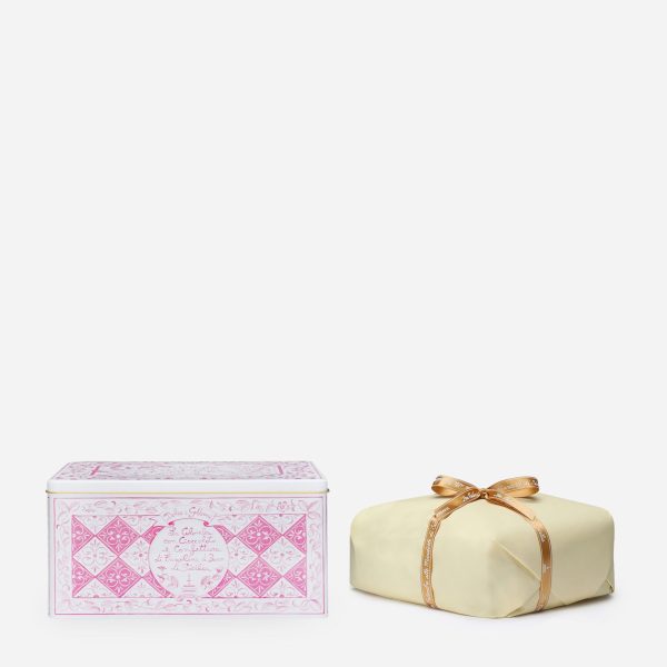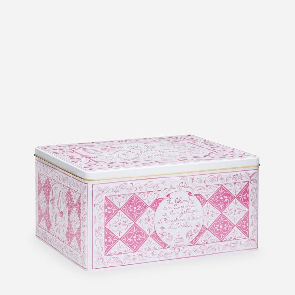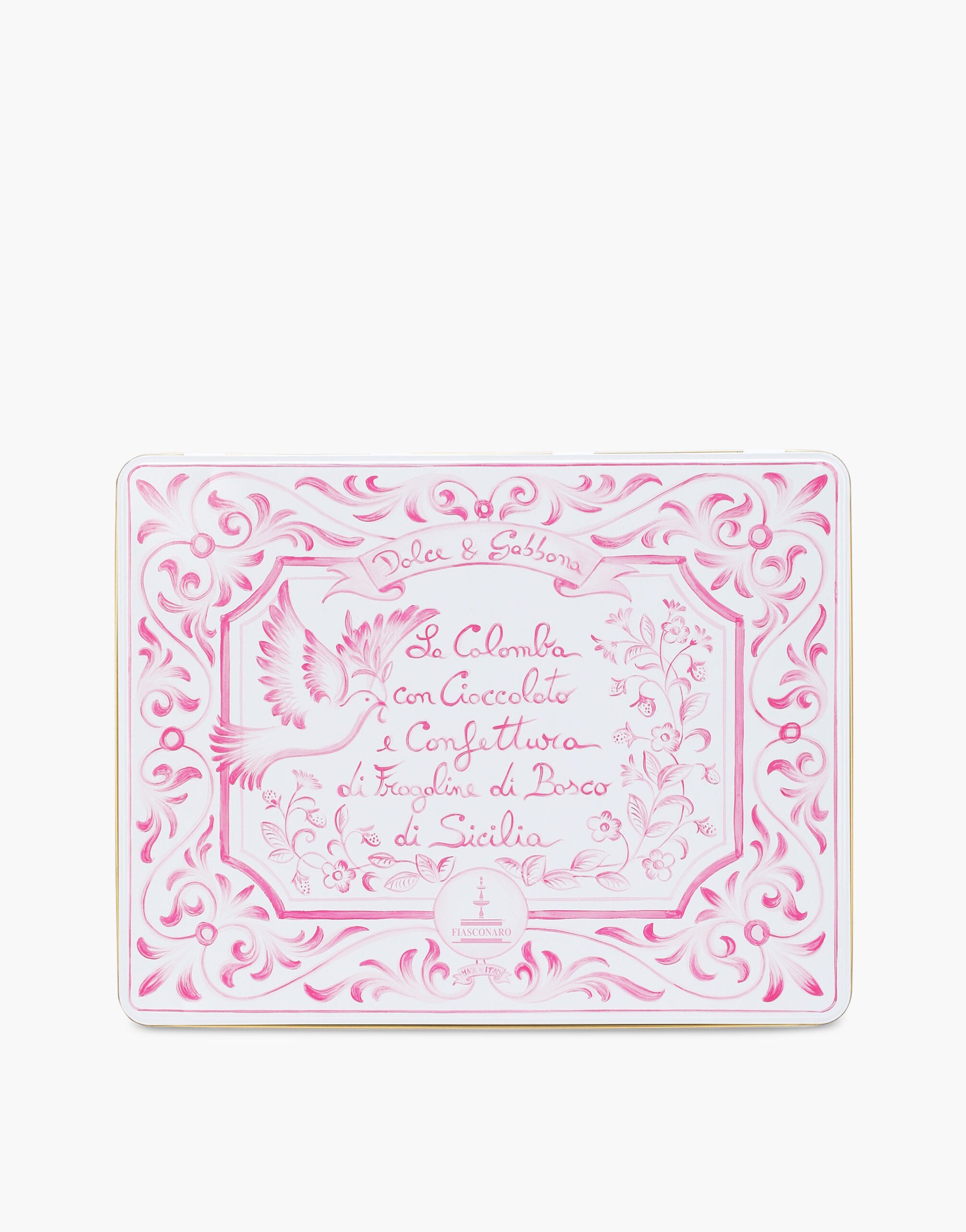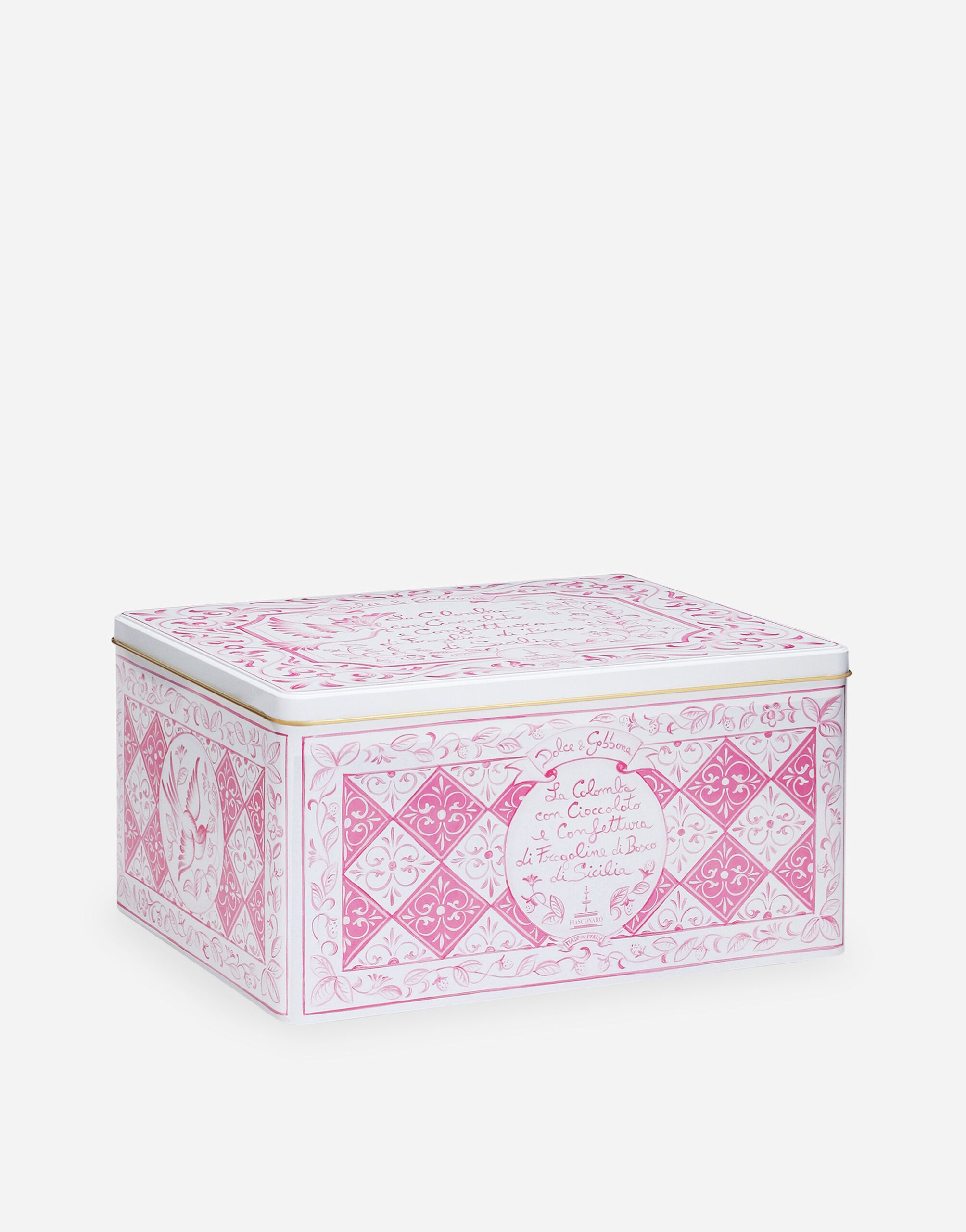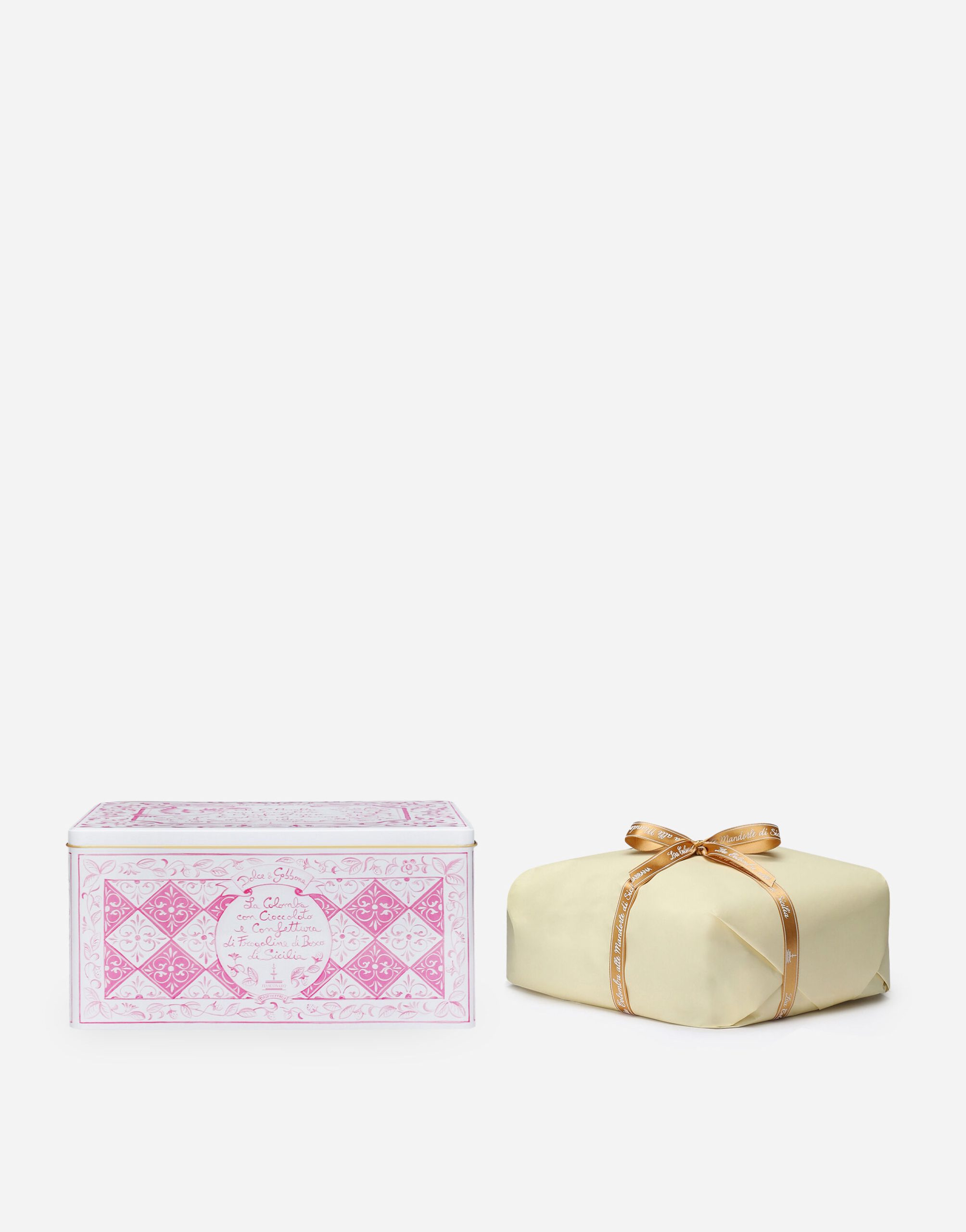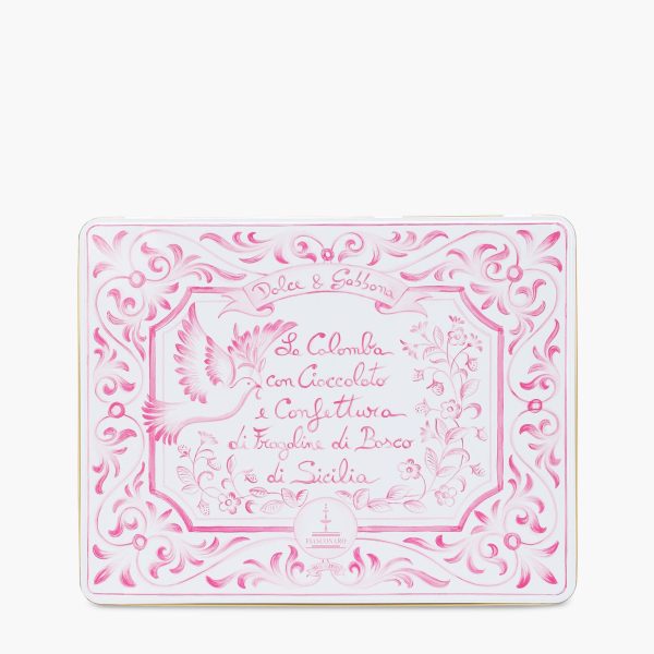 Πασχαλινή Colomba Dolce & Gabbana σε ροζ ορθογώνιο μεταλλικό κουτί με επικάλυψη από μαύρη σοκολάτα και μαρμελάδα από άγριες φράουλες Σικελίας. Δώρο το άλειμμα μαύρης σοκολάτας και το μαχαιράκι επάλειψης.